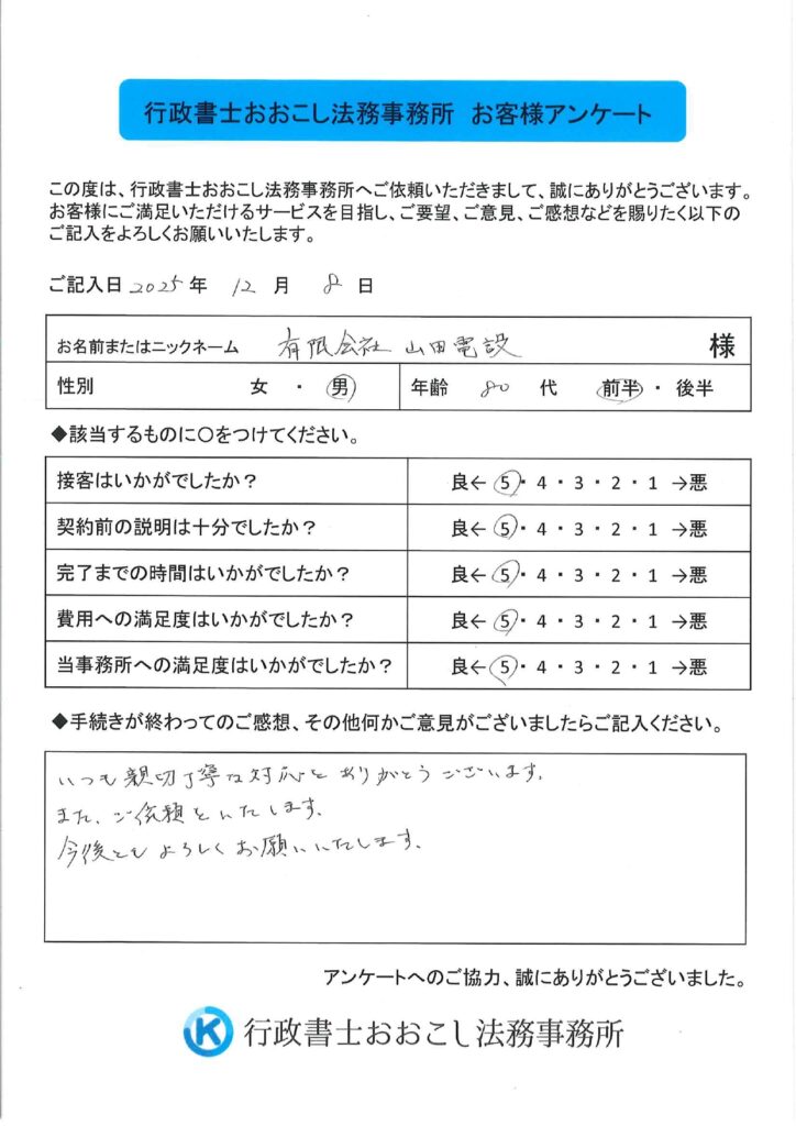 東京都 有限会社山田電設様【決算変更届(決算報告書)】